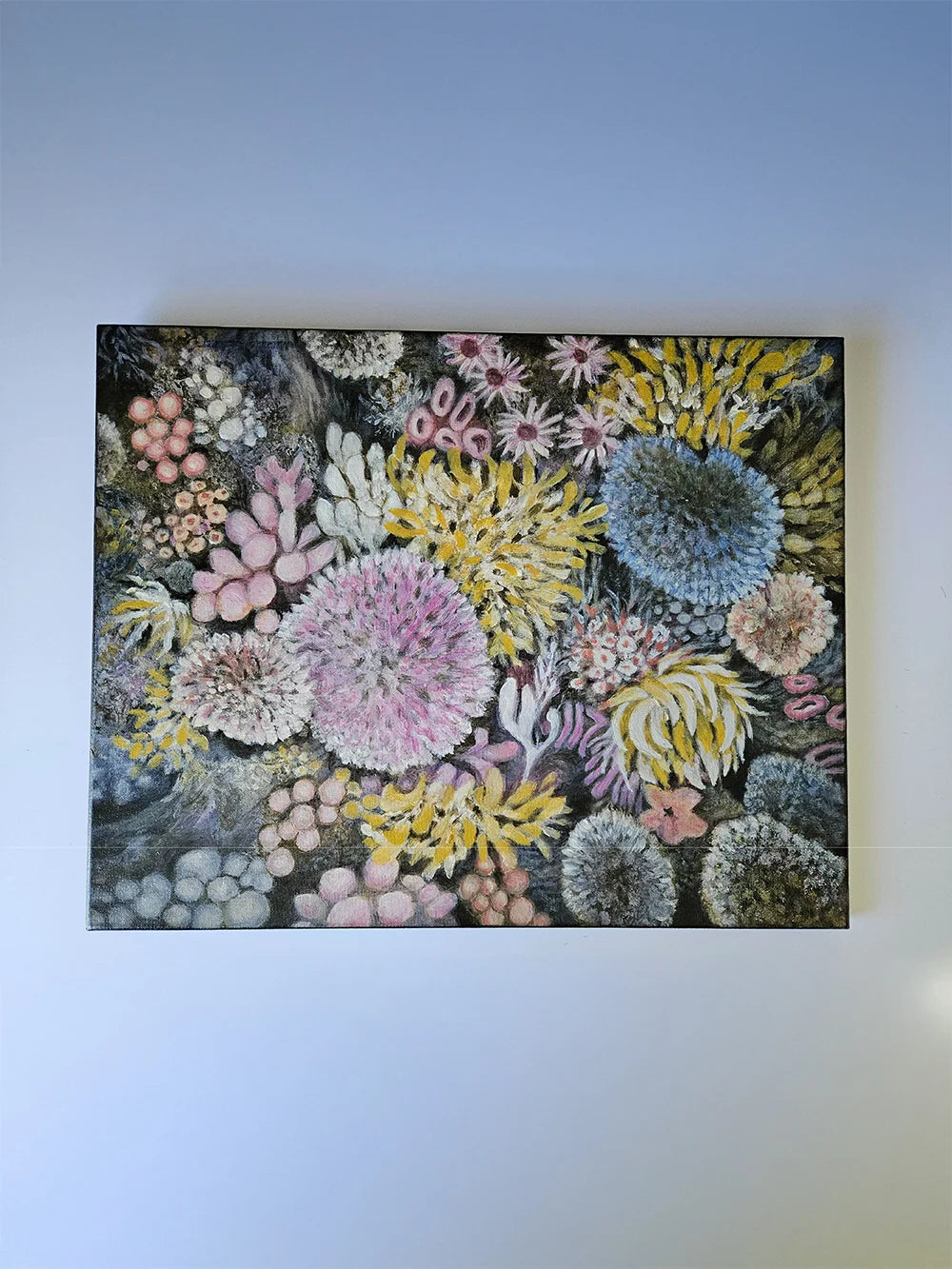 Fourish is a colourful, textural and joyful painting which reflects and celebrates the bountiful nature of parts of the reef. It brings back wonderful memories of my childhood and the exciting discoveries made whilst snorkelling on our holidays. Among the unusual shapes and textures of the corals I allow glimpses of the textured rocky reef. These are secretive and mysterious places, eroded and stained, and where new life can form.