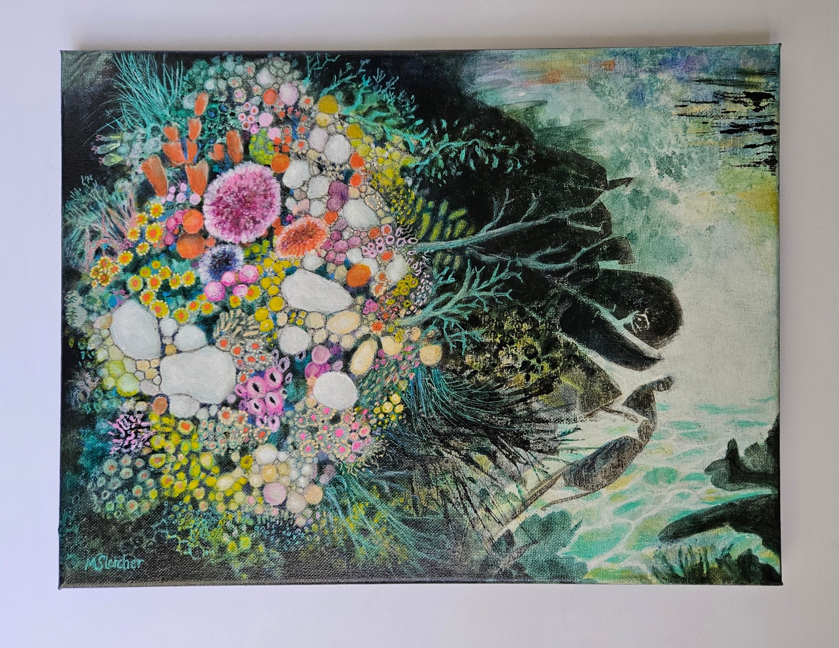 Ghost is the result of my exploring different ways of applying acrylic to canvas and in the process of creating an interesting textured background for my colourful corals, the shape of the turtle was unintentionally created much to my delight! It is well known that the reef relies on the turtles to eat seagrasses which could overgrow and smother corals, and in turn turtles need the reef for protection and food. This reliance on each other is under threat however, with the turtles and corals being affected by climate change as well as pollution. Recent cyclones have resulted in the death of many turtles as well as the destruction of corals that are smashed by rocks and waves, and having a deadly impact on the reef. This painting makes us consider the ramifications of the loss of turtles and also how this loss could affect the sensitive reef environs, and vice versa.